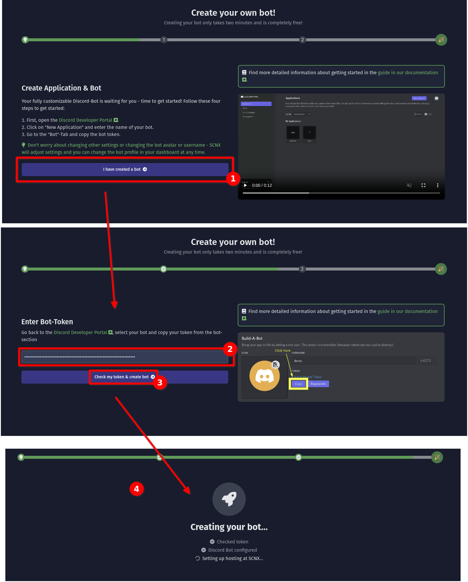 You'll find a video showing how you should create the Discord-Bot. If you've followed this guide, you can confidently skip this using the "I have created a bot"-button. Next, you'll be asked to enter the token you obtained in step 1. Do this and click on "Check my token & create bot". SCNX will now verify your token, configure the Discord-Bot for you and set up hosting at SCNX - this might take a few seconds.
